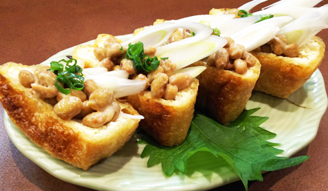 切った断面に納豆、長ねぎ、小ねぎをのせ完成です。