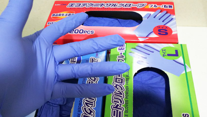 手袋を着用致します。サイズはS、M、L、とあるので、自分の手に合った物を着用します。